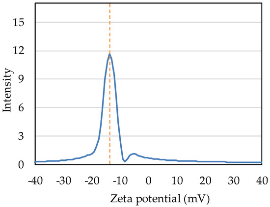 Intensity distribution measurement shows that the zeta potential of nB in deionized water was −13.71 mV (Figure 7).
