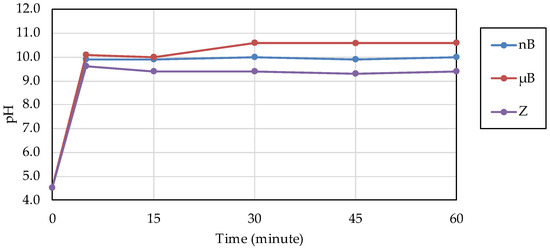 The acid buffering capacity of nB was tested at different concentrations. At any concentration, the pH increased rapidly after the start of immersion, and at concentrations of 5.0 mg/mL and higher, the pH reached approximately 10 after 5 min of immersion (Figure 8). Then, the acid buffering capacities of the particle samples were compared. Like nB, both µB and Z show a rapid increase in pH after immersion, and the pH reached 9.5 or higher after 5 min of immersion of any particle sample (Figure 9). There was no size-dependent difference between µB and nB.