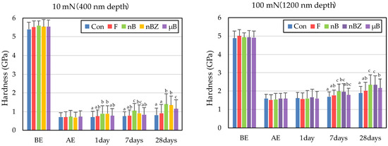 To quantify the examined mechanical properties, the rates (%) of recovery in hardness and elastic coefficient were determined from the results obtained with an indentation load of 100 mN (difference between BE and after 28-day immersion). The rates (%) of recovery in hardness (H) and elastic coefficient (E) were calculated based on the following equations [43]: