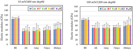 After 28-day immersion, the enamel samples immersed in nB show significant recovery in hardness compared with those immersed in µB when tested at a load of 10 mN or 100 mN. Like hardness, the elastic coefficient was greater in the enamel samples immersed in nB after the remineralization test than in those immersed in µB. However, there was no significant difference between the two groups, except for the significantly high recovery observed in samples immersed in nBZ after 28 days at 100 mN load.