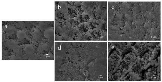 Representative SEM photomicrographs of the enamel specimens after remineralization tests for 28 days ((a) control; (b) F; (c) nB; (d) nBZ; (e) µB; 5000× magnification image).
