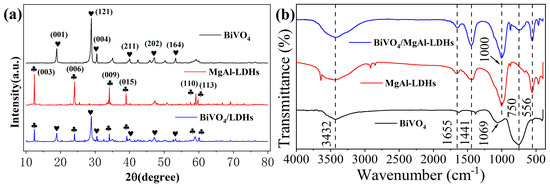XRD patterns for BiVO4, MgAl–LDHs and BiVO4/ MgAl–LDHs (a) and FTIR spectra of BiVO4/ MgAl–LDHs, MgAl–LDHs and BiVO4 (b).