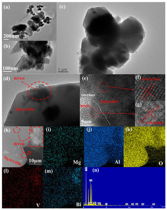 TEM images of BiVO4 (a), MgAl–LDHs (b), and BiVO4/MgAl–LDHs (c,d); HRTEM images of BiVO4/MgAl–LDHs (e–g); SEM–EDS elemental mapping images of BiVO4/MgAl–LDHs (h–m); and EDS spectrum of BiVO4/MgAl–LDHs (n).