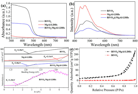 UV–vis diffuse reflectance spectra of BiVO4, MgAl–LDHs and BiVO4/MgAl–LDHs (a); photoluminescence spectra of BiVO4, MgAl–LDHs and BiVO4/MgAl–LDHs excited at 260 nm (b); optical band gaps of BiVO4, MgAl–LDHs and BiVO4 (c); Nitrogen sorption isotherms for BiVO4 and the BiVO4/MgAl–LDHs (d).