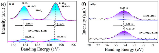 XPS of BiVO4, MgAl–LDHs, and BiVO4/MgAl–LDHs was used to explore the changes in the elemental compositions and states of the sample surfaces after recombination. As shown in Figure 6a, the composite material BiVO4/MgAl–LDHs are mainly composed of five elements, Mg, Al, Bi, V, and O, and the contents of Mg and Bi are relatively small; this trend is consistent with the results of Figure 4n, further determining the elemental compositions of the composite BiVO4/MgAl–LDHs. By taking the peak at C 1s 284.8 eV as the reference standard (Figure 6c) [49], we find two sets of characteristic peaks at 531.64 eV and 533.65 eV (Figure 6d); the peak at 531.64 eV is mainly attributed to the metal oxide oxygen in the group [50], and the peak at 533.65 eV may be related to C–O–C and O–C=O in MgAl–LDHs [51]. In the XPS images of pure BiVO4 V 2p (Figure 6b), the two peaks at 524.23 eV and 516.73 eV belong to V 2p1/2 and V 2p3/2, respectively [52]. Compared with pure BiVO4, in the composite material BiVO4/MgAl–LDHs, the peak intensities of both V 2p1/2 and V 2p3/2 decrease, mainly because the greatly reduced low-valent V participates in the redox reaction and is consumed during composite synthesis. Second, the peaks at V 2p1/2 and V 2p3/2 move forward to 524.6 eV and 517.09 eV, respectively. The two peaks at 158.92 eV and 164.24 eV in Figure 6e represent Bi 4f5/2 and Bi 4f7/2, respectively, indicating that the ion form of Bi in the composite photocatalyst is Bi3+ [53]. Compared with pure BiVO4, Bi 4f5/2 and Bi 4f7/2 in BiVO4/MgAl–LDHs move in the direction of high binding energy. Here, the electron binding energies are 159.08 eV and 164.33 eV for Bi 4f5/2 and Bi 4f7/2, respectively. The above positive movement phenomenon may occur due to the deposition of BiVO4 on MgAl–LDHs. This deposition changes the local chemical environment so that BiVO4 can act as an acceptor to receive photogenerated electrons transferred from MgAl–LDHs; related studies have resulted in similar conclusions [54,55]. Contrary to the direction of movement of the abovementioned orbital electron binding energy, unlike pure MgAl–LDHs, the electron binding energy at Al 2p in BiVO4/MgAl–LDHs moves inversely from 74.15 to 74.13 eV (Figure 6f), which may be related to the newly formed unstable bond in the composite [56].