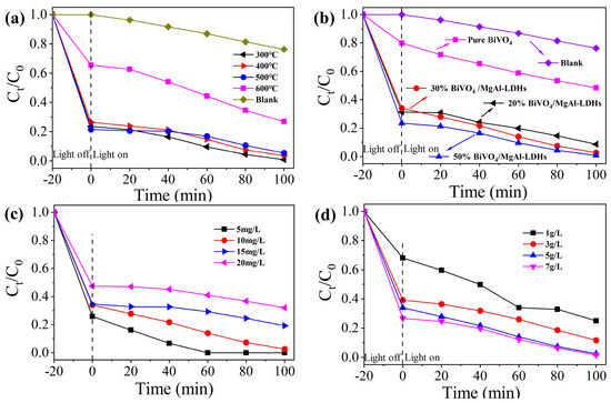 To explore the effect of the calcination temperature of MgAl–LDHs on the adsorption of visible light and catalytic removal of MB, the products of the MgAl–LDHs were calcined at 300 °C, 400 °C, 500 °C, and 600 °C (MgAl–LDO), and a composite with BiVO4 was synthesized. The synthetic steps of the composite visible light catalytic materials are shown in Figure 1. The photocatalytic capabilities of these four composite materials were evaluated under identical conditions, and the results are illustrated in Figure 7a. At calcination temperatures between 300 °C and 500 °C, the adsorption efficiencies of the composite materials remain around 75%. However, as the calcination temperature increases to 600 °C, the adsorption efficiencies of the composite materials decrease to 34.6%. These substantial drops in the adsorption efficiencies are primarily attributed to the collapse and disruption of the core layered structures of the calcination products, resulting in the formation of a spinel structure with a smaller specific surface area and pore volume. Secondly, the degradation rates of the blank control group and the 300 °C, 400 °C, 500 °C, and 600 °C calcination groups are 23%, 92.4%, 86.8%, 75.0%, and 59.0%, respectively. The four composite materials show better photocatalytic performance than the control group, among which the photocatalytic effects at a calcination temperature of 300 °C are the best and at a calcination temperature of 600 °C are the poorest. This phenomenon occurs mainly because as the calcination temperature increases, the morphologies and crystal structures of the calcination products change to varying degrees. When the calcination temperature increases to 300 °C, MgAl–LDHs release H2O and CO2 successively. Based on the memory effect [57], MgAl–LDHs after calcination can still recover their layered structures in the presence of deionized water. We prepared BiVO4/MgAl–LDHs by combining MgAl–LDHs in layered reconstruction with BiVO4. When the calcination temperature increases from 300 °C to 400 °C and then to 500 °C, the MgAl–LDHs after calcination cannot recover their regular and orderly original layered structures, and their memory effects begin to weaken. Here, the degradation rate of the composite photocatalytic material begins to decrease. When the calcination temperature further increases to 600 °C, the main layered structures of the MgAl–LDHs are completely collapsed and destroyed, forming spinel structures with small specific surface areas and pore volumes; additionally, the memory effect is lost. Moreover, the degradation rate of the composite-formed photocatalytic material is the lowest. Second, when the calcination temperature is 250 °C [58] or lower [40], MgAl–LDHs lose interlayer water without significant structural changes, and their memory effects cannot be used to compound Bi–VO4/MgAl–LDHs; therefore, the calcination temperature of MgAl–LDHs in this study is selected as 300 °C.