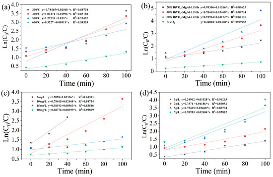 Kinetic fits for visible light catalytic degradation of MB in solution with different calcination temperatures (a), ratios (b), initial dye concentrations (c), and photo–catalyst concentrations (d).