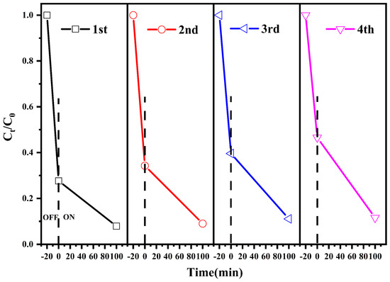To evaluate the chemical stability and reusability of the composite photocatalytic material BiVO4/MgAl–LDHs, after each experiment, the residue suspended in the beaker was allowed to stand for one day. Subsequently, the supernatant in the beaker was ex–tracted, and the photocatalytic material was washed three times with absolute ethanol. Finally, the washed photocatalytic material was transferred to a dry box for drying. This process was repeated four times with the same test conditions mentioned above. As il–lustrated in Figure 9, after four repeated tests, the adsorption–degradation rate of MB solution can reach 88.4% (only 8.7% loss), and the results show that the newly prepared photocatalytic composite has good durability and stability. In addition, studies have shown that the repeated use of photocatalysts has little effect on their physical and chemical properties [60,65].