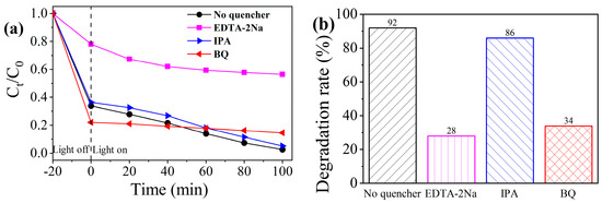 To clarify the main active species in the photocatalytic reaction process, EDTA–2Na [66] was selected as the quencher of photogenerated holes (h+), IPA [67] was selected as the quencher of hydroxyl radicals (·OH), and BQ [68] was used as the quencher of su–peroxide radicals (·O2−). The photocatalytic experiment was conducted under the same experimental conditions. The results are shown in Figure 10a,b. The degradation rates corresponding to EDTA-2Na, IPA, and BQ are 28%, 86%, and 34%, respectively, and the degradation rates are 64%, 6%, and 58% lower than those of the group without a quenching agent. The results show that ·O2− and h+ are the main active substances in the photocatalytic reaction process, while the effect of ·OH is relatively weak; Tang et al. drew the same conclusion [12].