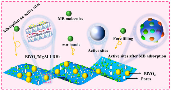 The study indicates that organic compounds exhibit a strong affinity for the surfaces of clay minerals [33], and as the surface area of the adsorbent increases, its adsorption capacity also increase continuously [69]. Furthermore, when MB diffuses within the composite materials with higher porosities, they are readily adsorbed onto the pore walls. From Table 1, it is evident that the composite material BiVO4/MgAl–LDHs has a significantly larger specific surface area and greater porosity, providing a foundation for rapid adsorption of a substantial quantity of MB in a short time. Moreover, the surface functional groups also play a crucial role in the adsorption process [61]. The adsorption of MB on BiVO4/MgAl–LDHs in the dark is illustrated in Figure 11. The adsorption mechanism is primarily governed by the following three modes of adsorption: (i) the agglomeration of BiVO4 in the composite material is ameliorated, exposing more surface active sites compared to the pure BiVO4. On the other hand, the MgAl–LDHs within the composite material inherently possess large specific surface areas and abundant surface active sites. Consequently, the composite material adsorbs many MB molecules at the surface active sites. (ii) During the process of pore filling in the composite material Bi–VO4/MgAl–LDHs, some of the MB is consumed. (iii) The free MB interacts strongly with the oxygen functional groups present in the composite material, such as OH, C–O–C, O–C=O, and forms strong π-π bonds [70] (as shown in Figure 6).