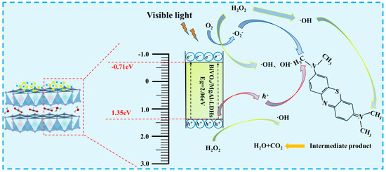 Zeng et al. [71] discovered that photocatalytic activity is primarily related to the ad–sorption capacity of the target pollutant and the degree of separation for photogenerated electron–hole pairs. Based on the aforementioned results, it is evident that the composite material BiVO4/MgAl–LDHs, which was obtained by loading BiVO4 during the MgAl–LDH reconstruction process, exhibits strong adsorption. The oxygen and metal vacan–cies generated during the layer-by-layer reconstruction process reduces the band gap, broadens the light absorption range, and also promotes the separation of the photogen–erated charge carriers. Additionally, research has confirmed that MgAl–LDH particles can serve as a barrier layer for electrons, leading to improved spatial charge separation [32]. As depicted in Figure 5c, compared to pure BiVO4 and pure MgAl–LDHs, the com–posite material BiVO4/MgAl–LDHs exhibits a smaller band gap, indicating a broader range of visible light absorption. Figure 5c shows that the band gap and valence band potential of BiVO4/MgAl–LDHs are 2.06 eV and 1.35 eV, respectively. Additionally, based on the relationship between the band gap, the valence band, and the conduction band potential (Ec = Ev − E), the conduction band potential of BiVO4/MgAl–LDHs is −0.71eV. A schematic representation of the band gap energy for BiVO4/MgAl-LDHs is illustrated in Figure 12. The visible light degradation mechanism is shown in Equations (5)–(11) [60]. When the composite material BiVO4/MgAl–LDHs is excited by visible light, photogener–ated electrons in the valence band are promoted to the conduction band, leaving an equal number of photogenerated holes in the valence band. At this point, the MgAl–LDHs act as electron transfer agents, facilitating the transfer of electrons from the con–duction band to the surface of MgAl-LDHs (Equation (4)), thus reducing the rate of pho–togenerated charge carrier recombination. In the redox reactions of the photogenerated electrons and holes, O2 is reduced to ·O2− and H2O is oxidized to ·OH. Finally, through the combined effects of various reactive species, the MB is ultimately degraded into H2O, CO2, and various intermediate products (Equations (8)–(11)), as illustrated in Figure 12 [24].