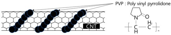 In the case of PVP-based surfactants, because each molecular unit of pyrrolidone is a long-chain polymer chemically bonded to the main chain of polyethylene, they wrap around the CNTs, as shown in Figure 2 which is a schematic illustration. As shown in Figure 2, because PVP wraps around CNTs in the form of chains, the molecular stability of the PVP-based aqueous dispersions is determined to be superior to that of the PC-based surfactants based on chemical adsorption [22,23].