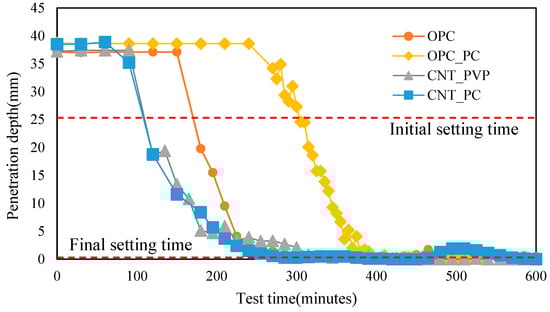 The results of the Vicat needle test are shown in Figure 4. The setting time of the cement paste was determined according to ASTM C 191 [31], and in the case of OPC, the initial setting time measured 174 min after mixing. For the samples containing the CNT aqueous dispersion with PVP surfactants, the initial setting time measured at 112 min, and when PC-based surfactants were used as a dispersant, the initial setting time was measured at 109 min. When CNT aqueous dispersions were mixed, the setting time decreased by approximately 1 h compared to that of OPC, regardless of the type of surfactant used. In addition, the final setting time was measured at similar values between 280 and 300 min for all cases. Generally, PC surfactant delayed cement hydration. As shown in Figure 4, this caused a delay of about 1 h compared to OPC when the same amount used for CNT dispersion with PC surfactant was used. However, when CNT dispersed with PC surfactant was incorporated, the final setting time was similar to that of the OPC final setting time, and the initial setting time was short.