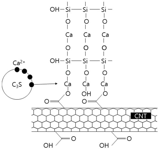 It is believed that because of the surface potential of CNTs, Ca2+ ions of C3S, which are mostly present in cement particles, move close to the CNTs and have a role as a nucleation seed for the formation of cement hydrates so that calcium silicate hydrates (C-S-H) can be formed in an accelerated initial cement hydrate reaction (Figure 5). In particular, when PC-based surfactants are used, OH− is adsorbed on the surface of CNTs by COOH− groups, forming C-S-H, as shown in Figure 5, which is considered to accelerate the initial hydrate reaction. However, the final setting times gradually converged to similar values. This indicates that the mixing of CNTs acts as a bridge that promotes C-S-H formation, rather than forming chemical bonds, in the overall process of C-S-H formation, which is believed to have not affected the total amount of C-S-H hydrate formation. This indicates that CNTs have the role of a nucleation seed that promotes C-S-H rather than forming a chemical reaction in the process.
