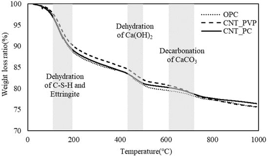 Thermogravimetric analysis (TGA) was conducted to OPC–CNT composites of 28 days, and it increased at a constant rate of 10 °C/min up to 1000 °C. The weight loss curve obtained from the analysis is shown in Figure 6. The results confirmed that there was no significant difference between OPC and OPC–CNT composites. The weight loss ratio obtained by the dehydration of C-S-H and ettringite was in the range of 80–160 °C, and the weight loss obtained by the dehydration of Ca(OH)2 was observed at approximately 450 °C. At 665–800 °C, weight loss due to the decomposition of CaCO3 into CaO and CO2 (decarbonation) was observed. In the overall results, the weight loss ratio due to the dehydration of C-S-H hydrate was the largest, and this result was similar to the values reported in previous studies in the weight loss curve of cement [29,34]. Therefore, as with the results of the Vicat needle test, the TGA results also showed that CNTs do not contribute to the formation of a chemical reaction of cement hydration. CNTs only improve mechanical properties by decreasing internal voids in the microstructure and the role of the nucleation seed that promotes C-S-H.