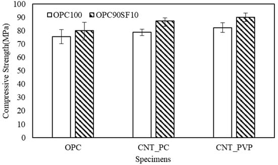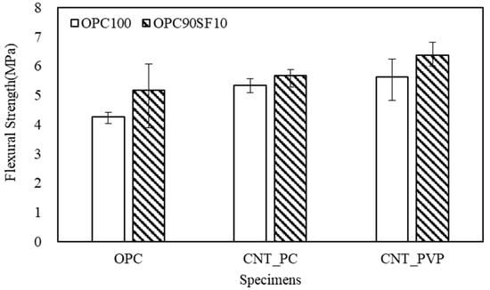 To analyze the mechanical properties of the specimens, the compressive strength and flexural strength were measured based on the 28th day, and the results are shown in Figure 7 and Figure 8. The compressive strength of OPC was measured at 75.53 MPa, and with 10% replacement of silica fume, the compressive strength increased to 80.27 MPa. When using CNT aqueous dispersions prepared with PC-based surfactants, the compressive strength was 78.78 MPa, and with 10% replacement of silica fume, the compressive strength increased to 87.33 MPa. When using CNT aqueous dispersions prepared with PVP surfactants, the compressive strength was 82.20 MPa, and with a 10% replacement of silica fume, the compressive strength increased to 90.10 MPa.