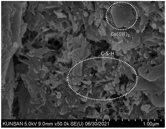 The flexural strength was measured using a 300 kN UTM after the specimens were water-cured for 28 d. The analysis instrument that was used was AG-300KMX of SHIMADZU, and the test specimens for flexural strength were fabricated with dimensions of 40 × 40 × 160 mm with ASTM C 348 [33], and the analysis was performed using the average value of three specimens’ measurements by employing a three-point load flexural test.