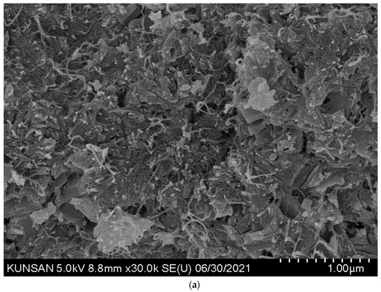 To examine the CNT morphology and dispersion, SEM images for the 28th day cement paste were obtained, and Hitachi’s SU8220 (Tokyo, Japan) (high-resolution field-emission scanning electron microscope) was used as the SEM analysis instrument. After the compressive strength test, the crushed paste specimens were placed in the sample holder and stored with the hydration stopped, and samples of a size appropriate for conducting SEM analysis were prepared.