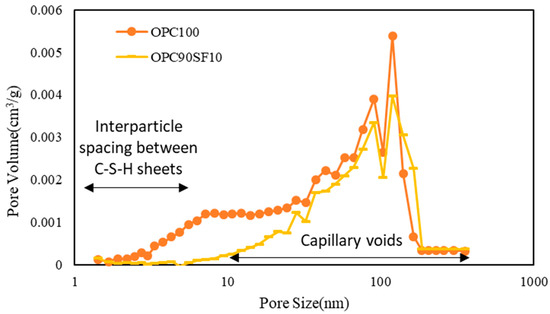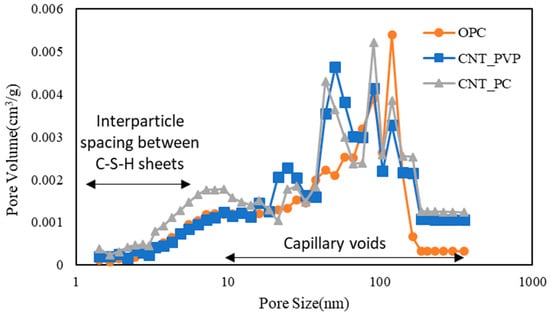 Figure 14 shows the pore volume per unit weight according to the pore size with 10% of the admixture replacement with a silica fume. Owing to the effect of the silica fume, the volume of micropores between C-S-H sheets significantly decreased compared to that of 100% OPC, and most of the voids were measured as capillary voids. As shown in Figure 15, a similar result was observed in the case involving mixing the CNT aqueous dispersions prepared with PC-based superplasticizer. Therefore, the results confirmed that by mixing CNT aqueous dispersions, the effect of filling the micropores between C-S-H sheets was insignificant compared to the effect of the silica fume.