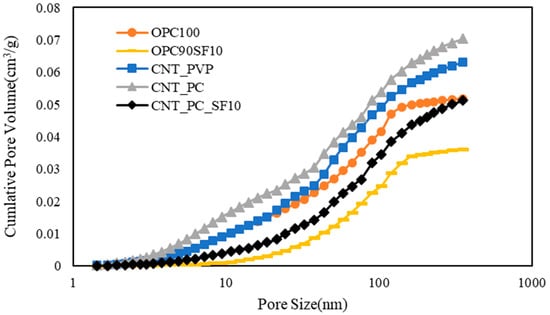The results of the BET analysis on the 28th day for the OPC–CNT composites microstructure are shown in Figure 13, Figure 14 and Figure 15, and the results of the total cumulative pore volume are presented in Figure 16. In the case of the OPC–CNT composites, as shown in Figure 13, micropores were observed between the C-S-H sheets, and most of the voids were measured as capillary voids. In the case of the paste mixed with CNT aqueous dispersions, there was a result of dispersing the pore volume per unit weight of capillary voids with a size of 100 nm. When PC-based surfactants were used for the preparation of CNT aqueous dispersions, there was a relative increase in the micropores between the C-S-H sheets. However, the overall results were similar to those of PVP surfactants.