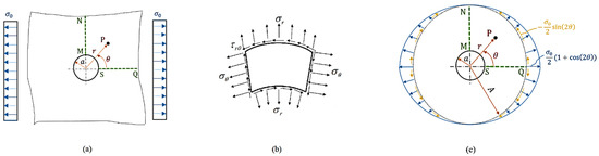 Equation (6) forms one of the few closed-form solutions in the theory of elasticity, whose expressions are twofold. Firstly, it demonstrates that if r and tend to a and , respectively, the stress concentration factor, namely, the ratio between the hoop stress and the applied load, is identically three. Another important consequence consists of the derivation of the expression for the far-field radial and shear stresses at a sufficiently large distance from the hole by making r tend to , namely,
