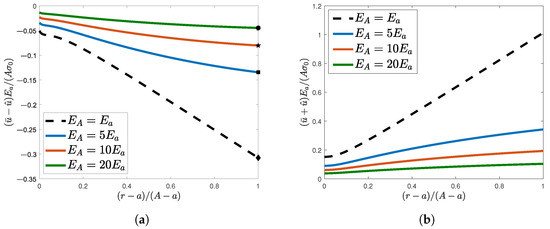 For clarity of exposition, the radial displacement fields along the MN and SQ are shown in Figure 2a,b respectively, which show the quantities and , respectively. It is worth noting that the radial displacement along the MN was negative along the lines and up to the limit radius (whose values are highlighted by the scatter points in Figure 2a), thus confirming the Poisson’s effect when the plate is subject to a far-field traction load. As far as the displacement along the SQ at the limit radius is concerned, it is not difficult to notice that it decreased as long as the stiffness ratio reached higher values, which is in agreement with the physical idea of the corresponding continuously hardened plates.