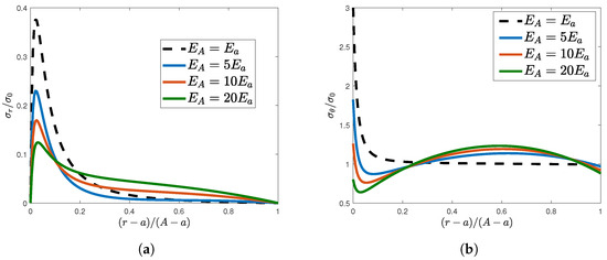 In this section, a numerical solution for the above mentioned BVP is presented and shown in graphical form. For simplicity, let the Young’s modulus linear distributions be described by the ratio . Consider four instances of this ratio: One of them is associated with the value referring to the homogeneous case for the mere sake of comparison, while the others are 5, 10, and 20. Unless explicitly specified, let the dashed lines refer to numerical solutions associated with the homogeneous case. The derivation of the stresses in units of MPa requires one to express the stiffness in the same unit, the radius of the hole a, the limit radius A in mm, and the slope e in Equation (1), which is given by