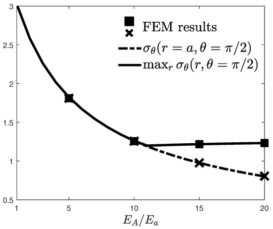 For the sake of validation of these numerical results, a numerical model for the plate has been developed by means of the finite element methods (FEM). Due to symmetrical load and geometrical considerations, the numerical model consisted of the quarter of the plate and employed plane stress elements. Symmetric boundary conditions and the uniaxial load have been correctly applied to the model. The radial direction has been discretized into radial strips, each of which is isotropic and homogeneous and has the same mechanical properties. Adjacent layers present different properties such that the resulting piecewise constant variation mimics the linear Young’s modulus distribution. Maximum hoop stresses and the stress concentration factors have been computed and reported as scatter points in Figure 4, which shows a remarkable fit with the numerical results obtained by the method described in Section 3.
