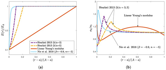 Eventually, some remarks on the worthiness of the considered Young’s modulus distribution will be addressed. This can be assessed by fixing an instance for the stiffness ratio, e.g., , and comparing its elastic performance with that associated with different laws, which are largely employed in the literature (Figure 5a). Sound comparison criteria could include the maximum hoop stress along the radial domain and determing whether this value occurs at the hole periphery. For instance, for the specified inhomogeneity parameters and n in the generalized power laws considered in [17], namely,