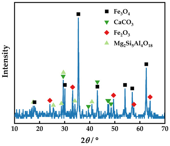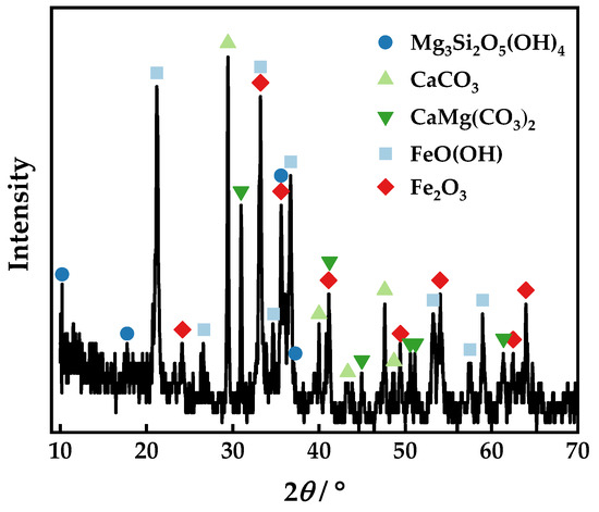 The arsenic-bearing iron ore was sourced from Yunnan Province. Samples for chemical analysis were collected through a process of multi-point sampling and division. Analysis of the sample revealed that the ore had 0.70% As and 45.32% Fe with a binary alkalinity of 1.24, as demonstrated in Table 1. As illustrated in Table 2, the iron present in the ore is mainly composed of hematite and limonite, with a minor proportion of magnetite. The other iron minerals were siderite, ferrosilite, and pyrite, in combination with C, Si, and S, respectively. The distribution of iron minerals indicates that the oxidation degree of iron is high, and the magnetic properties of the raw materials of the iron ore may be weak. High valent iron oxides were identified in the XRD (X-Ray diffraction) spectrum of the ore in Figure 1. The phase retrieval results demonstrate that the diffraction peak intensity of carbonate and hydroxide phases is relatively high, indicating that most of the losses in Table 1 are carbonate and hydroxide. As the concentration of arsenic-bearing minerals was lower than the XRD detection limit of 1%, it was not detected in the sample. The complex mineral phase and arsenic content indicate the difficult utilization characteristics of the mine.