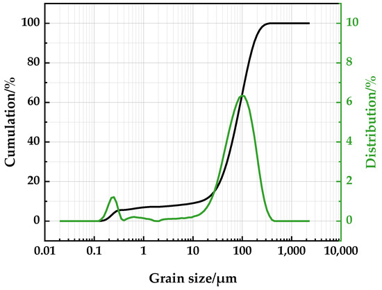 The iron ore containing arsenic has a certain level of fineness. Analysis (Figure 2) with the laser particle size analyzer revealed that the particle size of this mineral is mainly distributed between 0.139 and 0.448 μm and 10.59 and 399.4 μm, and the peak particle size of the mass fraction distribution is 105.4 μm. The true density of this ore is greater than the standard cement sample, which is 3.79 g/cm3, as shown in Table 3. According to the Blaine method [23], the specific surface area was measured to be 603.8 cm2/g, which is significantly lower than the standard cement sample, being only one-sixth of it. Figure 3 displays the ore sample that has been imaged using a combination of an SEM (scanning electron microscope) and EDX (energy dispersive X-ray detector). Microscopic observation revealed two particles of irregular shape and angular form. The largest observed sizes of the particles were 301 μm and 231 μm, respectively, which are within the expected range of particle sizes observed in laser particle size analysis. Analysis of the four randomly chosen points on the two particles reveals that the ore is mainly composed of oxides of iron and other metals, accompanied by a fraction of carbonates and silicate. The EDX analysis corroborates the chemical analysis results described in Table 2. It was apparent from the observation that it was complex to extract arsenic from the iron minerals through physical separation.