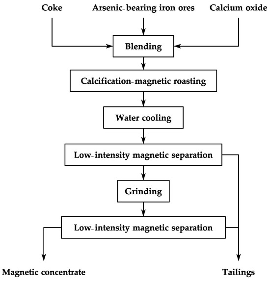 Beneficiation of valuable metals from iron ores can be achieved through flotation or magnetic separation technologies, taking into account the difference in wettability or the coefficient of magnetization between arsenopyrite or other arsenic-bearing sulfide minerals and other iron minerals such as magnetite, hematite, and goethite [5,6,7]. However, it has been experimentally proved that it is difficult to effectively beneficiate the metal values from such iron ores via physical beneficiation methods, such as flotation or magnetic separation. Roasting [2,8,9,10,11,12,13,14,15], sintering [3,16,17,18,19,20], and other chemical beneficiation methods are the conventional pyrometallurgical routes of arsenic-bearing ores, due to the volatility of arsenic and many of its oxides. Although the roasting and sintering processes removed the arsenic, it is costly as it requires gas-cleaning facilities and produces highly toxic gas, which could result in severe environmental contamination.