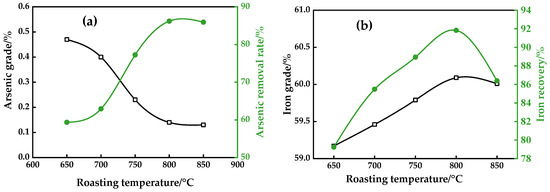 Effect of roasting temperature on arsenic removal (a) and iron recovery (b).