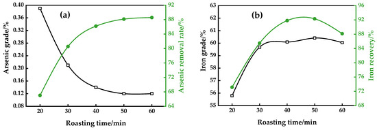 The opposite tendency was observed with the arsenic grade and removal rate, as shown in Figure 6a. The change in the arsenic grade and arsenic removal rate remained relatively stable after 50 min, at which point a magnetic concentrate assaying 0.12% As with 88.14% arsenic removal rate was obtained. It could be seen from Figure 6b that the iron grade and recovery of the magnetic concentrate increased with increasing roasting time, reaching a peak point at 50 min, where a concentrate assaying 64.68% Fe with an 87.89% recovery was obtained. Then, it declined with increasing roasting time.