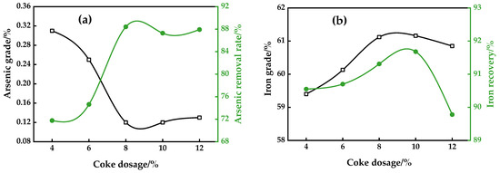 Effect of coke dosage on arsenic removal (a) and iron recovery (b).
