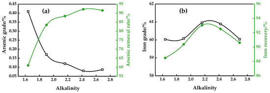 The effects of alkalinity in the CMR-LMS on the separation results were shown in Figure 7. The alkalinity is set to 1.64, 1.90, 2.16, 2.42, and 2.69 by adding an extra CaO dosage from 3–11% with a step length of 2%. As demonstrated in Figure 8, increasing the alkalinity resulted in an increase in the arsenic removal rate until reaching its maximum value and flattening out at an alkalinity of 2.42, where a concentrate containing 0.12% As was created with an iron recovery rate of 92.53%. When the alkalinity ranged from the origin to 2.16, there was a reduced transformation of minerals containing arsenic. The conversion of arsenic-bearing minerals is completed when the alkalinity is above 2.42. Over the extra 9% CaO dosage, it has little effect on the removal of arsenic. The results of the effect of alkalinity are analogous to the result of the dearsenization in iron ore sintering. During high alkaline sintering, a portion of As2O3 (g) will react with the oxides of Al or Ca to form AlAsO4 and Ca3(AsO4)2, thereby leaving residual arsenic in the sinter [3].