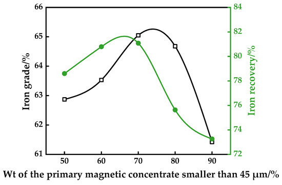 The grade and recovery of iron concentrate had the same tendency with the increase in the percentage of less than 45 μm in the feed. They increased until approaching the maximum values of around 70% particle size passing 45 μm, and then decreased. The maximum iron recovery was around 81.08%, with a 65.05% iron grade. This observation may be explained by the higher liberation of magnetite at a finer particle size, leading to a better quality of iron concentrate. The decrease in the recovery was due to the fact that it was more difficult to capture fine magnetite, as opposed to the coarse one, through magnetic separation.