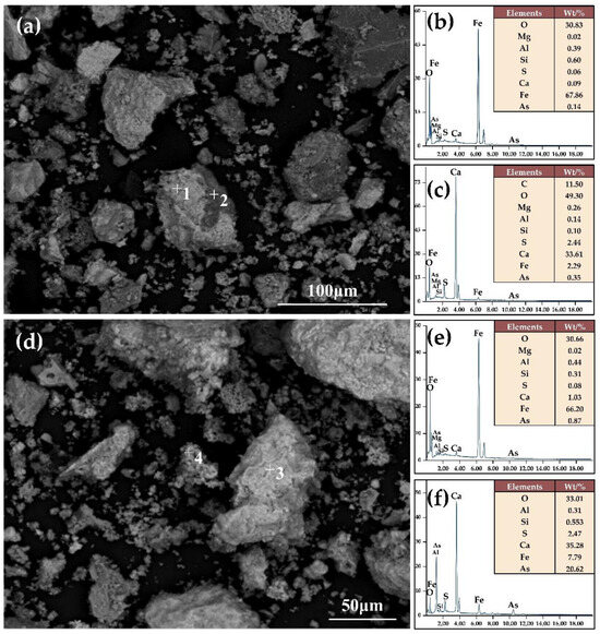Microscopic morphology (a,d) of the arsenic-bearing iron ore and elements analysis of points 1–4 categorized as (b,c,e,f), respectively.
