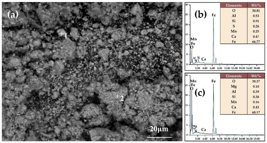 The final iron concentrate that has gone through secondary magnetic separation has a predetermined total iron content. Roasting with 10% coke, an alkalinity of 2.42, and a temperature of 800 °C for 50 min, and with 70% of the particles of the primary magnetic concentrate being smaller than 45 μm after grinding, as indicated in Figure 12, the predominant minerals in the end concentrate are magnetite, accompanied by a smaller proportion of hematite. Results from the EDX point scanning elemental analysis, as demonstrated in Figure 13b,c, indicate that the total iron content was over 65%, which is consistent with the total iron content obtained from chemical analysis in Figure 9. The microscopic morphology of the concentrate, shown in Figure 13a, reveals that the particle size of the iron concentrate is relatively fine, even though the agglomerated large particles are prevalently still smaller than 20 μm.