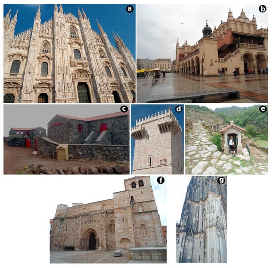 Examples of ornamental stone applications: (a) Milan Cathedral, Italy; (b) Main Market Square in Krakow, Poland; (c) houses, Saint Jorge Island, Portugal; (d) Estremoz Castle, Portugal; (e) small chapel for worship, Sistelo, Portugal; (f) San Juan de Puerta Nueva Church, Zamora, Spain; (g) Cologne Cathedral, Germany.