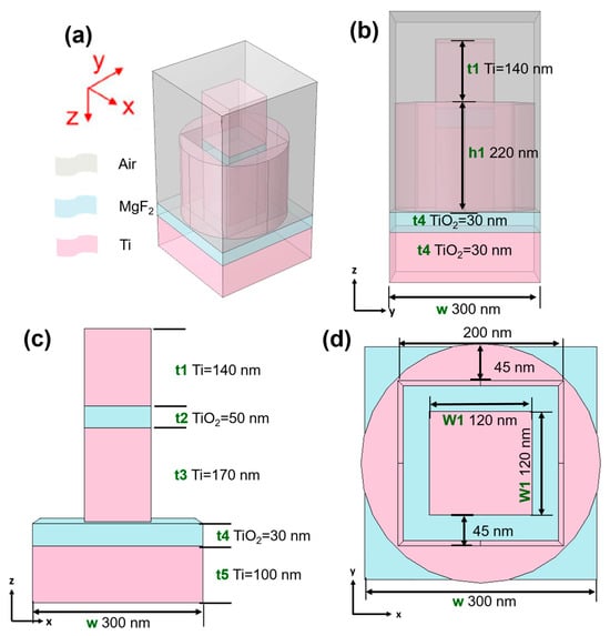 (2) In order to achieve a high absorptivity in the visible and near-infrared spectrum for the studied absorber, it is essential that the selected materials possess strong absorptive properties. These materials encompass metals, semiconductors, oxides, or other substances displaying robust absorption traits within the specific wavelength range of interest. The primary distinguishing feature of this study was the exclusive utilization of two materials: Ti and MgF2, as Figure 1a–d show.