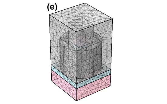 (7) If the initial design does not meet the desired absorption efficiency, the design is to be iterated by adjusting the parameters, layer thicknesses, or other geometric factors. Simulation tools can help in this iterative refinement process. At first, the absorber consisted of one Ti layer (t5 in Figure 1c) and one MgF2 layer (t4 in Figure 1c) arranged from bottom to left and with the optimal thicknesses of 100 nm and 30 nm, respectively. This optimization process adhered to a methodical approach in which we systematically adjusted one specific length or distance parameter at a time, as shown in Figure 1c,d, while keeping the original parameters of the other components constant. Through this iterative procedure, we evaluated the structure’s performance and desired properties as each designed parameter was varied. Figure 1e depicts the mesh structure of the investigated absorber, with the following parameters: 6465 grid nodes, a maximum grid length of 5.0 nm, a minimum grid length of 1.5 nm, a curvature factor of 0.6, 36,467 tetrahedra (finite elements), 7350 triangular elements, 708 edge finite elements, 56 endpoint elements, a minimum element quality of 0.03658, and an average element quality of 0.6117.
