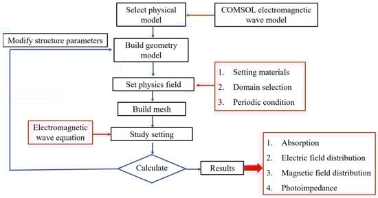Figure 2 shows the schematic diagram to illustrate the step-by-step process (flow chart) for designing an ultra-wideband, perfectly absorptive fractal absorber with a central square nanopillar within a cylindrical structure featuring a square hollow. The primary focus of the analysis is to select electromagnetic waves in the frequency domain as the physical quantity for examination. Subsequently, a geometric model is constructed, material properties are defined, the solution domain is chosen, and periodic conditions are set. Finally, a mesh is created to facilitate further analysis. Regarding the geometric model, a specific layer thickness parameter is fixed, and a parameter scan is performed sequentially to determine the optimal conditions. By solving the electromagnetic wave equations, absorption, electric field distribution, magnetic field distribution, and characteristic impedance can be obtained.