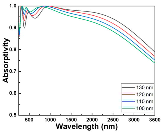 To verify the optimized parameters of each component material in this investigated absorber with a fractal structure, experiments for the parameter variations of each component material are individually conducted while keeping the parameters of other components constant. Figure 3, illustrating w1, the width of the central square pillar as presented in Figure 1c, can be employed to demonstrate changes in absorptivity among the various components of the absorber under investigation. This method forms the fundamental framework for determining the most suitable parameters for the absorber being studied, resulting in outstanding absorptivity and an exceptionally wide absorption spectrum. Figure 3 illustrates the alterations in the absorption spectra of the studied absorber when modifying the height of the cylindrical structure. Figure 3 also showcases the changes in absorptivity resulting from adjusting the parameter of an individual component while keeping the other parameters constant. The optimization of these parameters was conducted across a wavelength range spanning from 250 to 3500 nm. The outcomes presented in Figure 3 distinctly highlight the fact that the component parameters have apparent effects on the numerical outcomes of bandwidth and absorptivity. In order to gain a clear understanding of the absorption efficiency under various conditions, we have divided the absorption spectrum into three regions: ultraviolet (250–400 nm), visible light (400–700 nm), and infrared (700–3500 nm). Then, the maximum absorptivity within each of these regions was compared. Table 1 also presents a comparison of how the width of the central square pillar (w1) influences the maximum absorptivity of the examined absorber across various wavelength ranges. It is worth noting that, even at w1 = 120 nm, there is not a singular peak average absorptivity within the three regions. However, this particular structure exhibits the broadest bandwidth for absorptivity exceeding 90%.