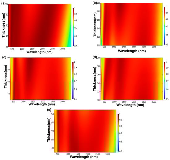 Figure 4a–e portray the variations in absorptivity exhibited by the investigated fractal absorber. These variations arise solely from the alteration of specific parameters: the thicknesses of the lower MgF2 layer (t4, Figure 4a), the central Ti layer (t3, Figure 4b), the upper MgF2 layer (t2, Figure 4c), the outermost Ti layer (t1, Figure 4d), and the height of the cylindrical Ti layer (h1, Figure 4e). The respective parameter ranges for t4, t3, t2, and t1 encompassed values between 30 and 70 nm, 100 and 200 nm, 30 and 100 nm, and 100 and 200 nm. Additionally, the range for the height of the cylindrical Ti layer, h1, extended from 170 to 270 nm. Notably, as depicted in Figure 3, absorptivity surpasses 99% within certain wavelength ranges. This observation highlights the exceptional absorption properties of the fractal-structured absorber within these specific wavelengths. This underscores the absorber’s capacity for perfect absorption, as indicated by the absorption characteristics under investigation. To ascertain the optimal parameters for the designed fractal absorber, simulations were conducted by systematically varying individual parameters while maintaining the others constant. Figure 4a illustrates the impact on absorptivity when solely adjusting the thickness of the lower MgF2 layer (t4) within the range of 30 to 70 nm. This evaluation focused on the fractal absorber presented in Figure 1. As shown in Figure 4a, the enlargement of the t4 layer thickness from 30 to 70 nm resulted in diminished absorptivity within the 800–1000 nm wavelength range. The absorptivity failed to exceed 90% during this adjustment, and consequently, a thickness of 30 nm was selected for the lower MgF2 layer. Specifically, for a t4 value of 30 nm, the investigated fractal absorber exhibited a substantial absorptivity within the wavelength range of 276–2668 nm.