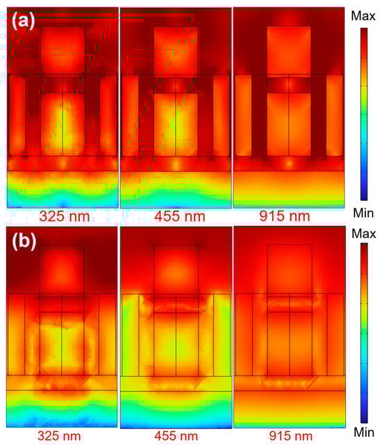 Localized surface plasmon is a form of surface plasmon resonance in metallic nanostructures. When light is incident upon these metallic nanostructures, the free electrons within the metal couple with the optical field, giving rise to localized surface plasmon resonance. This resonance leads to significant absorption and scattering effects at specific frequencies for the metallic nanostructures. A distinguishing feature of localized surface plasmon resonance is that their resonant wavelengths highly depend on the shape, size, and material properties of the metallic nanostructures. Therefore, by adjusting these parameters, control over the enhancement of localized surface plasmon resonance can be achieved. Because the wavelength and strength of localized surface plasmon resonance depend on the geometry and composition of the nanostructure, and it can be tuned by adjusting the dimensions of the round nanopillars and square hollow holes. Hence, the intensity of the localized surface plasmon resonance typically escalates with an increase in film thickness until a certain threshold is reached. Beyond this point, the intensity either levels off or begins to decline. The results shown in Figure 5a confirm that, across the incident light wavelengths of 325, 455, and 915 nm, the electric fields are primarily distributed throughout the entire absorber, because of the effect of the localized surface plasmon resonance.