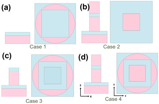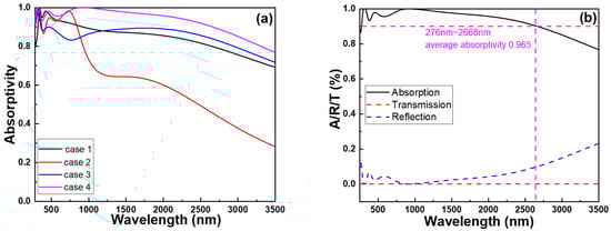 Compared to the original structure, Case 2’s configuration differs by the absence of the outer-ring cylinders, yet it retains the central square pillar intact, as Figure 6b shows. Consequently, it continues to exhibit a pronounced Fabry–Perot cavity resonance. However, due to the omission of the outer-ring cylindrical structure, it cannot mutually couple with the resonance mode of the square pillar. This leads to a substantial decrease in its absorption capacity. Compared to the original configuration, Case 3 features a modified structure with the omission of the top Ti (t1) layer on the square pillar, while still retaining the outer circular cylinder structure, as Figure 6c shows. Due to the absence of the uppermost metal layer, the square pillar in this model no longer exhibits a metal–dielectric–metal configuration. As a result, the effect of the Fabry–Perot cavity resonance becomes less pronounced, which in turn affects its absorption properties. This leads to a significant decrease in absorption compared to the absorption rate in the original setup, as Figure 7a shows. In the original configuration, the inclusion of the metal–dielectric–metal arrangement led to the formation of a resonant cavity. This cavity effectively trapped and amplified specific wavelengths, leading to increased absorption at those particular wavelengths. This phenomenon is commonly referred to as the Fabry–Perot cavity resonance.