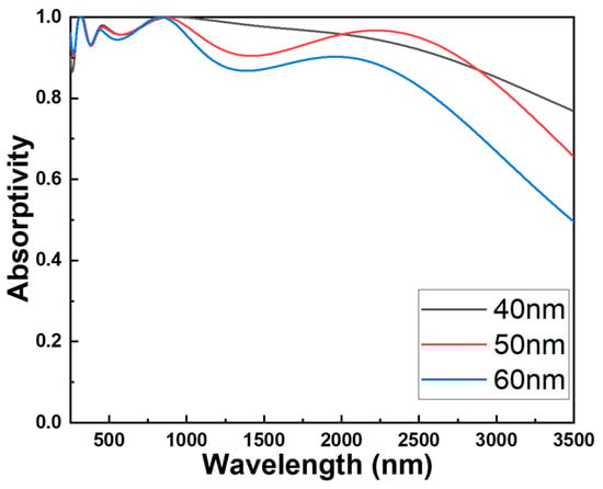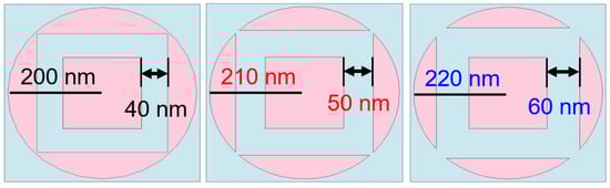 The effects of the different distances between the central square pillar and the cylindrical structure with a surrounding square hollow shown in Figure 8 on the maximum average absorptivity of the investigated absorber in different wavelength ranges are compared in Table 3. Even at a distance of 40 nm, there is no peak average absorptivity in the 250–400 nm region. However, this structure achieves the maximum average absorptivity in the other two regions.