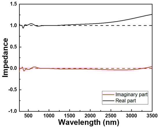 It is crucial to acknowledge that achieving these ideal conditions hinges on the designs and properties of an investigated absorber’s material, encompassing thickness, composition, and structure. Furthermore, the behavior might fluctuate based on the light’s wavelength and the specific attributes of the materials involved. Therefore, optical impedance is a significant parameter employed to describe the propagation characteristics of light waves within a medium and their interaction with materials. It offers insights into the energy transmission and absorption behavior of light and finds widespread applications in the field of optics. The real part of optical impedance reflects a material’s impedance to an alternating current. A real part of optical impedance close to one signifies that the material possesses very low impedance to an alternating current. In optical impedance analysis, the magnitude of the real part is contingent upon the material’s conductivity or conductivity characteristics. When a material has high conductivity, the real part of optical impedance approaches one. The imaginary part of optical impedance represents phase difference, and in this model, the imaginary part tends toward zero, indicating minimal energy loss. As illustrated in Figure 10, over the span of 250 to 2650 nm, the real component of the optical impedance gravitates towards unity, accompanied by a gradual diminishment of the imaginary component towards zero. This remarkable optical impedance profile seamlessly harmonizes with the outcomes previously observed. Notably, the extensive absorption observed across the wavelength range of 276 to 2668 nm surpassed an impressive threshold of 90.0%.