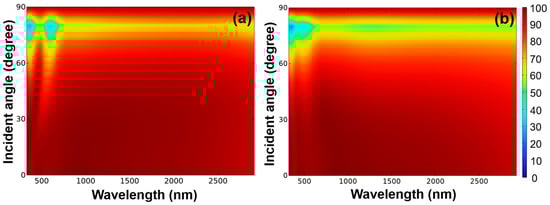 An optical absorber that functions optimally, regardless of the angle of incidence, proves to be more dependable in such circumstances. The absorption performance was evaluated across incident light angles spanning from 0 to 90 degrees, taking into account both TE and TM polarizations, and the corresponding outcomes are depicted in Figure 11. When the absorber was excited under TE polarization and within the wavelength range of approximately 250 to 700 nm, the investigated fractal absorber demonstrated an absorptivity exceeding 90% over an angular range of 0 to 50 degrees. However, within the wavelength range of approximately 700 to 2700 nm, the angular range of absorptivity exceeding 90% extended to 0–72 degrees. When the absorber was excited under TM polarization and within the wavelength range of approximately 250 to 700 nm, the investigated fractal absorber exhibited an absorptivity exceeding 90% over an angular range of 0 to 53 degrees. Moreover, within the wavelength range of approximately 700 to 2700 nm, the angular range of absorptivity exceeding 90% extended to 0–63 degrees. These findings also suggest that the designed fractal absorber exhibits insensitivity to incident angles, particularly in the near-IR region. Additionally, the absorber showcases remarkable absorption performance, thanks to its highly symmetrical structure, rendering it polarization independent.